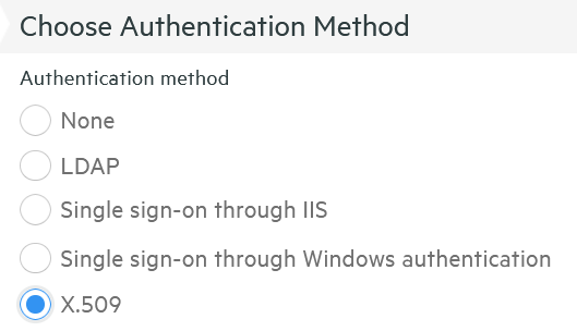 Using smart cards. If users will authenticate to the MSS Administrative Server with smart cards, select X.509. Further configuration may be required before running a simple test, noted in When smart cards are used for authentication.