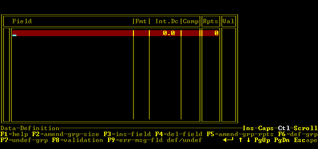 What you have just defined has disappeared from the screen, but it has not been lost. Generally, pressing Esc returns you to a higher level menu and retains what you have just defined. To confirm this, enter the Data Definition window again (select F2=data definition and then F2=data fields) to see it. Then press Esc twice to return to the main menu.