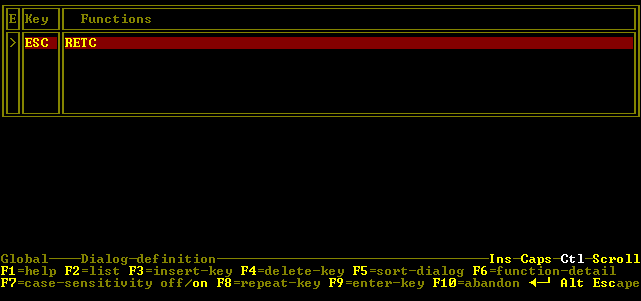There is one line already defined in the dialog. This defines that the event ESC (pressing the Esc key) will cause the action RETC (return to calling program). You have already seen the result of this definition, when you pressed Esc in the running screenset and it returned to the trap.