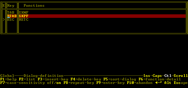 A dialog entry consists of an event (for example ESC) and one or more functions to be performed if the event occurs. A complete list of Dialog System functions can be found in the chapter Function Code List.