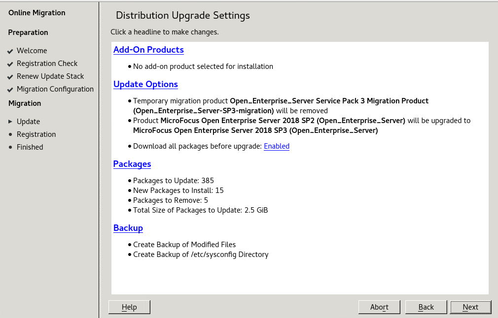 WARNING:If Product Micro Focus Open Enterprise Server 2018 SP2 (Open_Enterprise_Server) will be upgraded to Micro Focus Open Enterprise Server 2018 SP3 (Open_Enterprise_Server) is not displayed, click Abort and roll back the server.