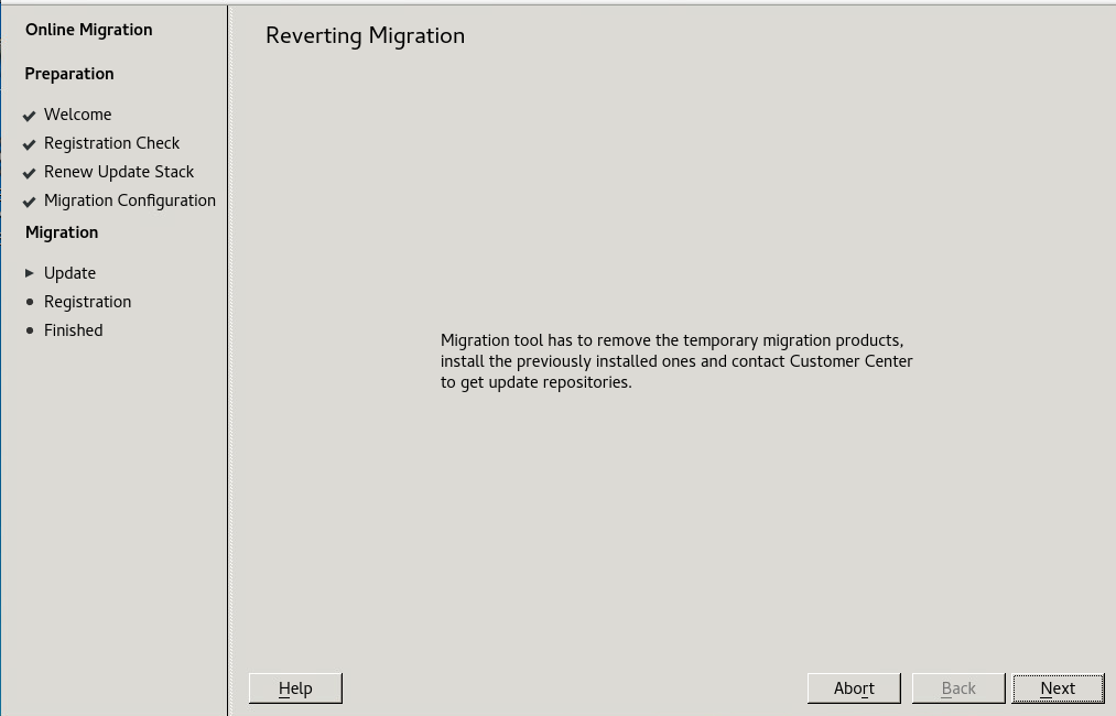 NOTE:If the repositories are not enabled, click Back > Next and redo the NCC registration until it is successful. If you are not able to do a successful NCC registration after multiple attempts, abort the process and roll back the server. For more information, see Section 5.6.4, Rolling Back the Server in the Middle of a Wagon-based Channel Upgrade.