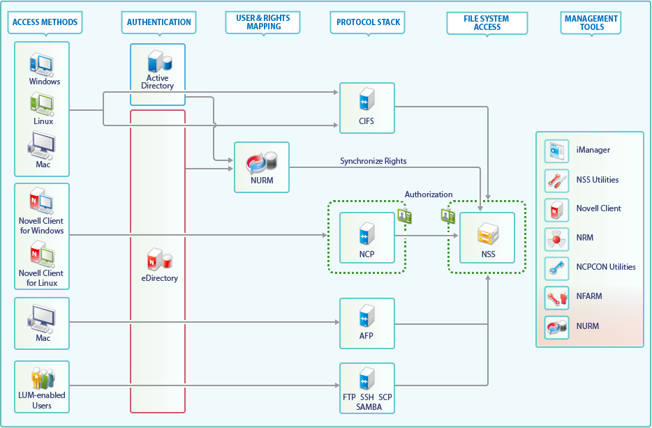 Rights Management: NFARM (AD only), iManager (eDirectory only), rights utility (supports AD and eDirectory), Client for Open Enterprise Server for Windows and Novell Client for Linux (eDirectory only), NCPCON utilities (eDirectory only).