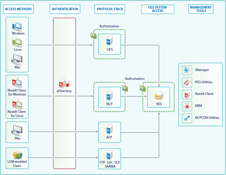In the traditional OES file access model, Windows and Linux workstations use the CIFS protocol for file access. Client for Open Enterprise Server software for both Windows and Linux uses the NetWare Core Protocol (NCP) to provide the file services and Macintosh workstations communicate using AFP or CIFS. To access NSS resources using FTP, SSH, and SCP, users must be LUM-enabled.