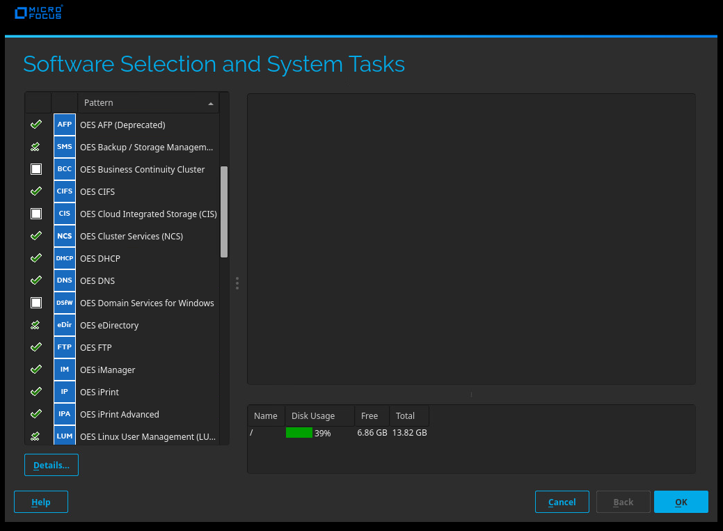 IMPORTANT:To install any of the OES patterns, you must customize the software selections. If you don’t make any selections, only the base OES packages are installed. However, you can install any of the patterns after the base OES installation is complete. See Installing or Configuring OES Services on an Existing OES 2018 SP3 Server.