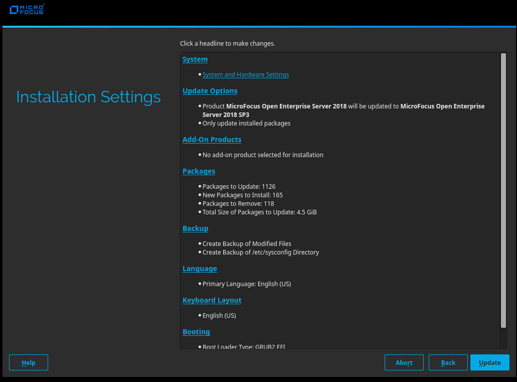 IMPORTANT:To verify that previously installed services are selected for installation and to install any additional OES services during the upgrade, you must customize the Update Options on the Installation Settings page.