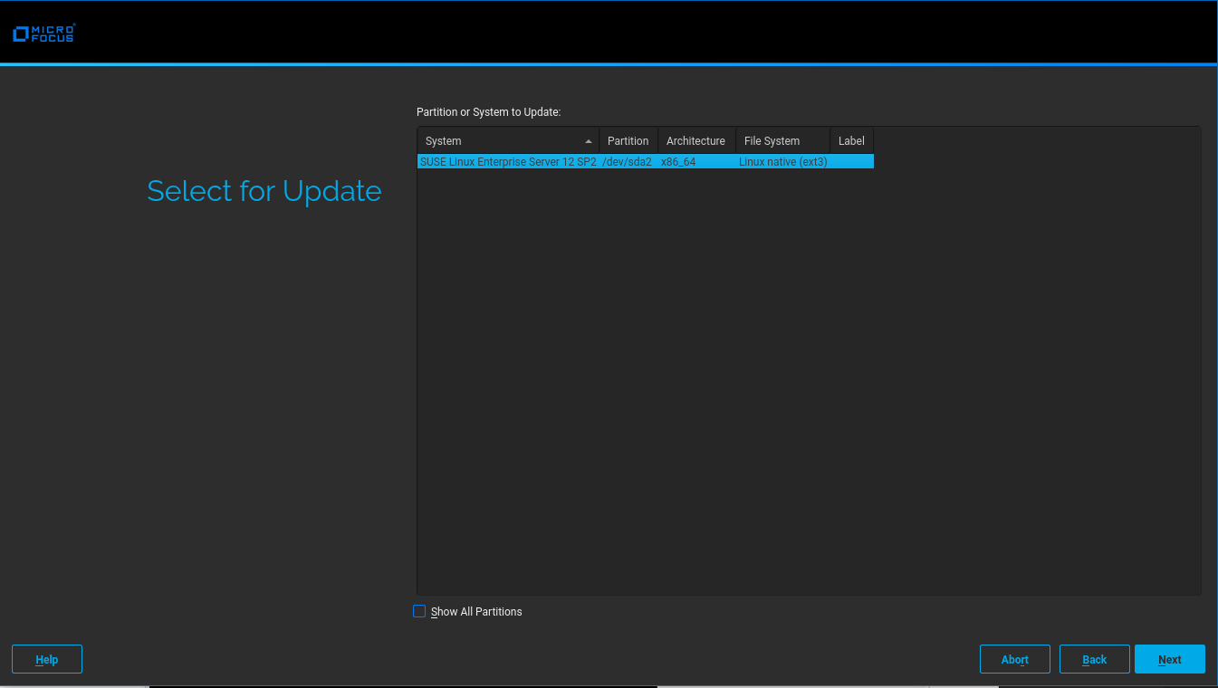 YaST tries to determine the correct root (/) partition. If there are several possibilities, or if YaST can’t definitely determine the correct root partition, the Select for Update page displays.