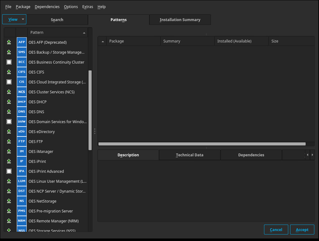IMPORTANT:If you deselect a pattern after selecting it, you are instructing the installation program to not install that pattern and all of its dependent patterns. Rather than deselecting a pattern, click Cancel to cancel your software selections, then click the Select Patterns heading again to choose your selections again.