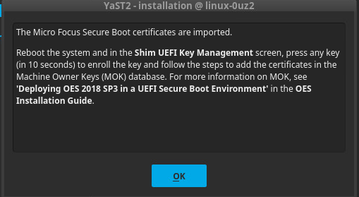 The OES installation imports the Micro Focus Secure Boot certificate under /etc/uefi/certs and prepares it to be enrolled into the Machine Owner Keys (MOK) database of the firmware. You need to complete the enrolling of the certificate by following Step 4 in the UEFI prompt.