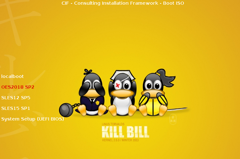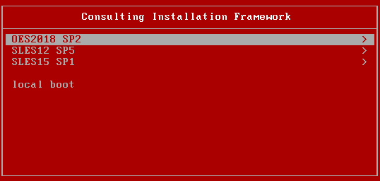 [SUBMenu_CIF] MenuTitle = CIF Target Selection option = submenu ; "OES2018 SP2"; "Select to Install/Upgrade to OES2018 SP2" ; SUBMenu_CIF_OES2018SP2 option = submenu ; "SLES12 SP5"; "Select to Install/Upgrade to SLES12 SP5" ; SUBMenu_CIF_SLES12SP5 option = submenu ; "SLES15 SP1"; "Select to Install/Upgrade to SLES15 SP1" ; SUBMenu_CIF_SLES15SP1 option = return ; "Return" ; "Return to main menu" option = exit ; "Exit" ; "Boot to local hard drive"