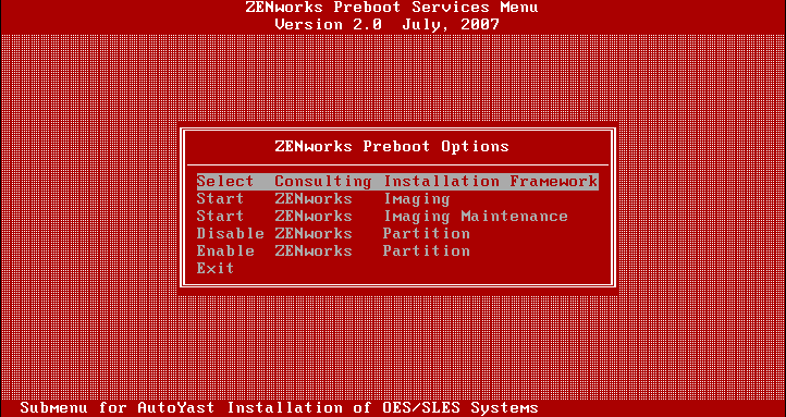 The first step in extending the Novell TFTP server configuration to support the installation of OES servers and SLES servers using the Consulting Installation Framework is to add a corresponding entry to the main menu, that is defined in /srv/tftp/pxemenu.txt.