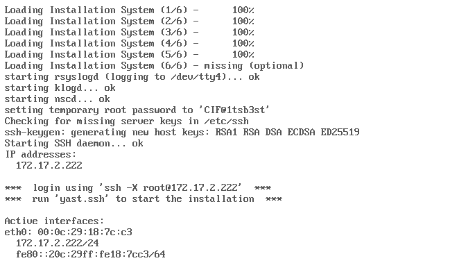 This can easily be achieved by adding the boot option ssh=1, which invokes the SSH daemon on the system being installed. If you do not specify a temporary root password by using the additional boot option sshpassword=<TemporaryRootPassword> the system will prompt for it.