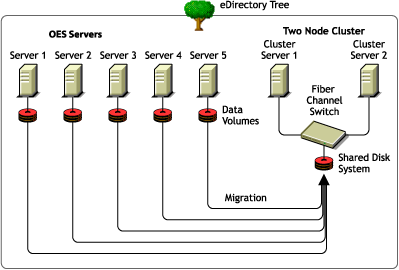 In this scenario (see Figure 1-2), you have five existing OES servers. You recently purchased two multiprocessor servers and the necessary hardware to create a two-node cluster complete with an attached Storage Area Network (SAN). You decide to install OES 2018 SP3 on the two-node cluster and to copy the data from each of the five servers to the SAN on the two-node cluster. Instead of manually moving all the data and Printer Agents or backing up the data and restoring it to the SAN, you can use the Migration Tool, which automates the data migration process.