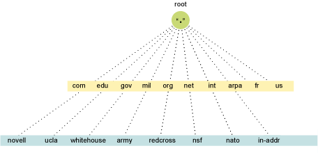 The domain names in the figure end with a period, representing the root domain. Domain names that end with a period are called fully qualified domain names (FQDNs).
