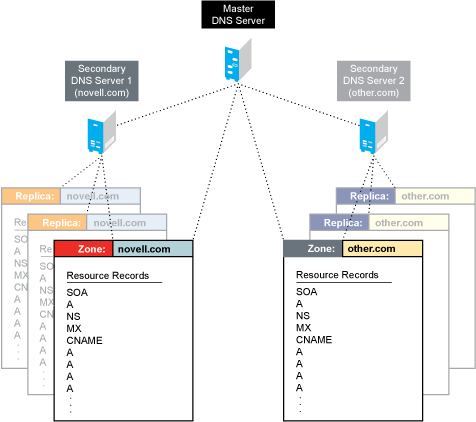 Figure 1-5 represents a traditional DNS strategy. A zone, such as novell.com, uses a primary DNS server to handle queries about the entities within it. A DNS server supports more than one zone, and it has at least one secondary server for backup (redundancy) or load-sharing purposes. The primary DNS server provides DNS name service for two zones: novell.com and other.com. The secondary DNS server 1 provides backup support for the novell.com zone, and the secondary DNS server 2 provides backup support for the other.com zone. When changes occur to the DNS database, the master files corresponding to that zone at the secondary server are updated by zone transfers.
