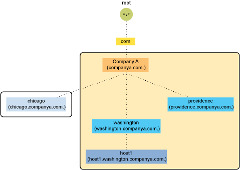 For example, Company A creates a domain called companya.com under the com top-level domain. Company A has separate LANs for its locations in Chicago, Washington, and Providence. Therefore, the network administrator for Company A decides to create a separate subdomain for each division, as shown in Figure 1-2, Domains and Subdomains.