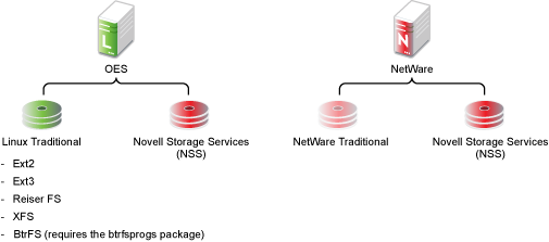 As shown in Figure 11-1, both OES and NetWare support Novell Storage Services as well as their traditional file systems.