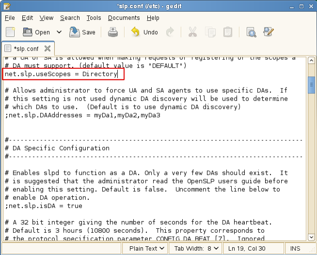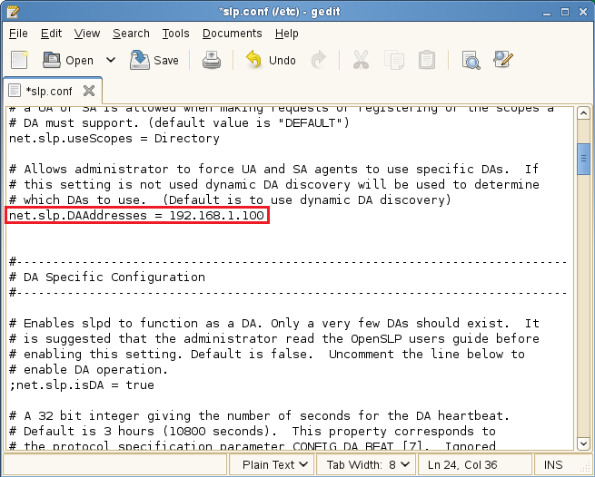 Modify the line by removing the semicolon and typing the actual IP address of the OpenSLP DA you defined in Setting Up an OpenSLP DA Server.