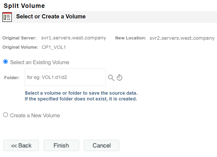Before splitting a volume, you can either select an existing volume or create a new volume as a target location to receive the source data.