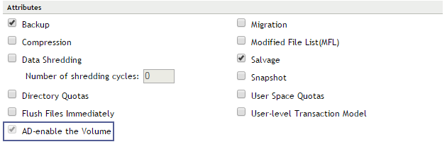 A new option AD-enable the Volume is introduced in OES 2015. This option is available only if the Pool containing the NSS volumes is media upgraded. If the volume is already AD-enabled, this option is disabled.