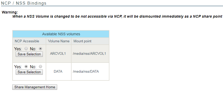 Select Manage NCP Services > Manage Shares, click NCP/NSS Bindings, then verify that the NCP Accessible parameter is turned off for the secondary volume, and turned on for the primary volume.