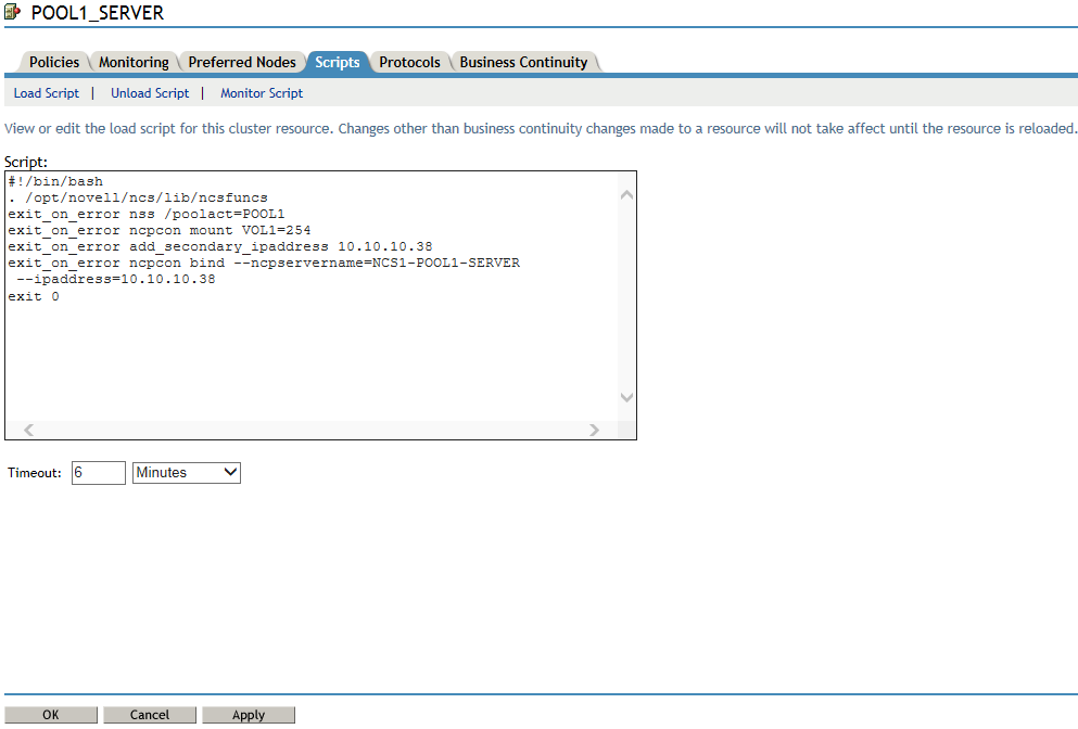 Monitor Script #!/bin/bash . /opt/novell/ncs/lib/ncsfuncs exit_on_error status_fs /dev/pool/POOL1 /opt/novell/nss/mnt/.pools/POOL1 nsspool exit_on_error status_secondary_ipaddress 10.10.10.38 exit_on_error ncpcon volume VOL1 exit_on_error rcnovell-cifs monitor exit 0 |