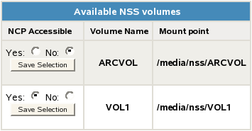 If the volume’s NCP Accessible setting is No, click Yes to make the NSS volume accessible to NCP so that the volume is automatically mounted in NCP after it is mounted in NSS.