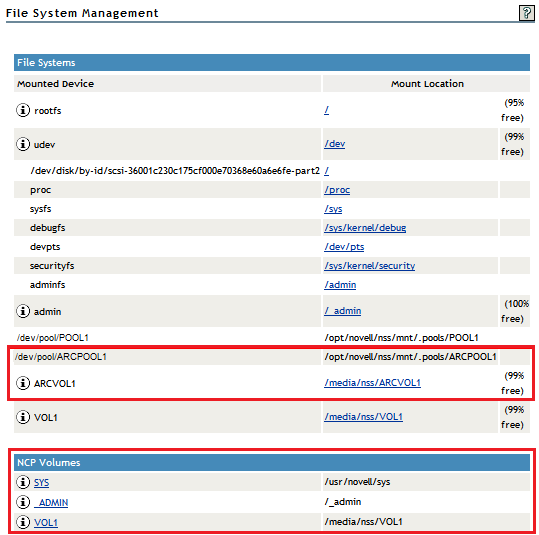Select View File System, then verify that the secondary pool ARCPOOL1 and the NSS volume ARCVOL1 are listed under File Systems, but the secondary NSS volume is not listed under NCP Volumes.
