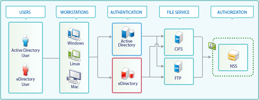 Both eDirectory and Active Directory are supported as identity sources. For eDirectory users, NMAS authentication is still used. For Active Directory users, CIFS interacts with Active Directory and the Kerberos service is used to authenticate the Active Directory users. |
