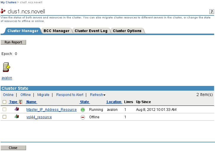 On the Cluster Manager page, select the check box next to the volume group cluster resource, then click Offline. Wait until the resource is offline to continue.