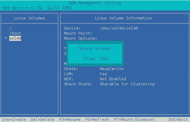 In the Linux Volumes list, select the clustered linux volume, then press Delete.