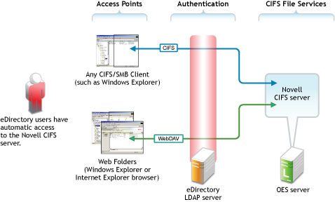 All file service access is controlled by LDAP-based authentication through the eDirectory LDAP server. Although it is shown separately, eDirectory could be installed on the OES server. |