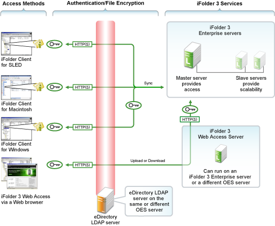 All file service access is controlled by LDAP- based authentication through the eDirectory LDAP server. Although it is shown separately, eDirectory could be installed on the OES server. Files can be encrypted for transport using SSL connections (HTTPS). |
