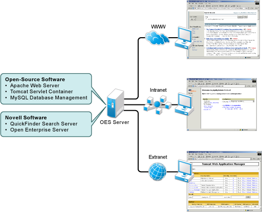 OES comes bundled with all of the Web Services and Applications components you need to host dynamic web content and deploy web applications that you can either build yourself or download from the World Wide Web. Some of these components are developed by the open source software community, while others are developed by Novell. Each component offers an important building block that lets you build the solutions that best meet your business needs.