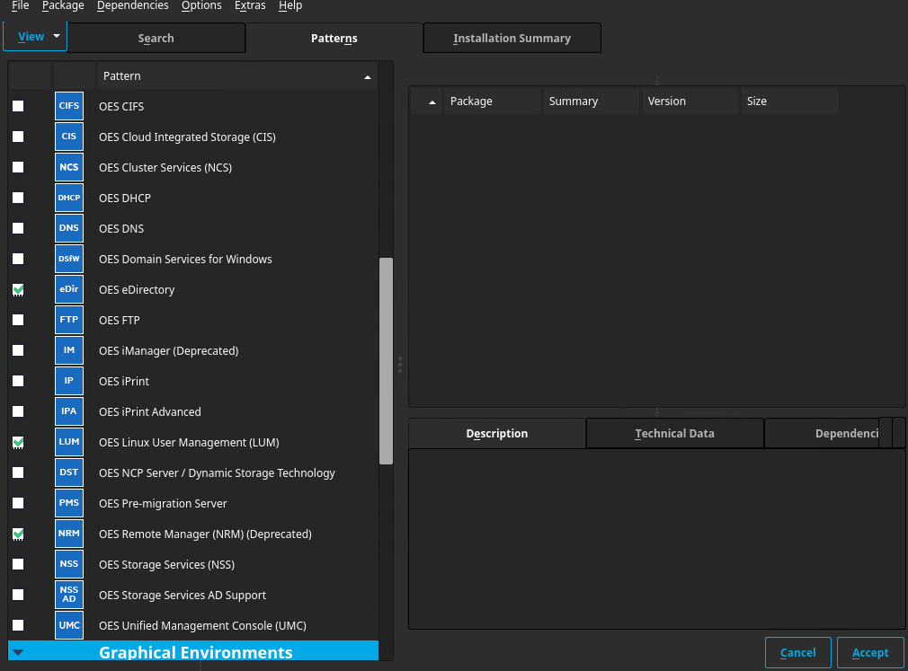 IMPORTANT:To install any of the OES patterns, you must customize the software selections. If you don’t make any selections, only the base OES packages are installed. However, you can install any of the patterns after the base OES installation is complete. See Installing or Configuring OES Services on an Existing OES Server.