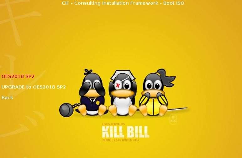 [SUBMenu_CIF] MenuTitle = CIF Target Selection option = submenu ; "OES2018 SP2"; "Select to Install/Upgrade to OES2018 SP2" ; SUBMenu_CIF_OES2018SP2 option = submenu ; "SLES12 SP5"; "Select to Install/Upgrade to SLES12 SP5" ; SUBMenu_CIF_SLES12SP5 option = submenu ; "SLES15 SP1"; "Select to Install/Upgrade to SLES15 SP1" ; SUBMenu_CIF_SLES15SP1 option = return ; "Return" ; "Return to main menu" option = exit ; "Exit" ; "Boot to local hard drive"