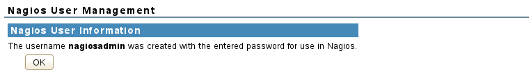 When a message confirms that the user nagiosadmin was created in Nagios with the password you provided, click OK to dismiss the message.