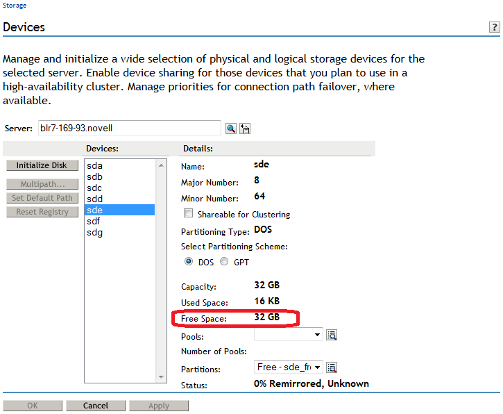 When the page refreshes, the device is initialized and available for further configuration with NSS pools and volumes.