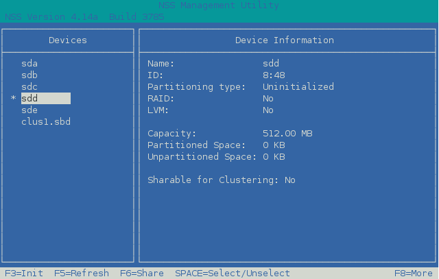 The device can be used for shared Novell partitions. Use with Novell Cluster Services SBD partitions and cluster-enabled NSS pools. The status is stored on a 4 KB partition on the device.