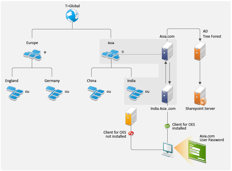 Clientless login and cross-platform file access for Windows users: From a standard Windows workstation, users can authenticate to an OES server running eDirectory without the need for the Client for Open Enterprise Server software or multiple logins. After the Windows workstations have joined the DSfW domain, authorized users can log in and access the file and print services they are authorized to use, whether the services are provided by OES servers in the DSfW domain or Windows servers in a trusted Active Directory domain.