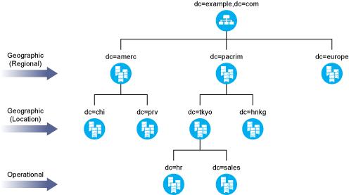 The scenarios explained here are only indicative of the various ways in which you can deploy DSfW server in your environment. Here the tree structure overlaps with the DNS namespace. For instance, the domain example.com will be mapped to dc=example,dc=com FQDN.
