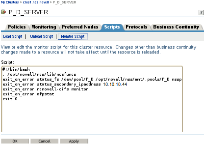 On the Monitor Script page in the resource properties, you must also configure the resource’s monitor script. You must take the resource offline and bring it online to apply the new settings.
