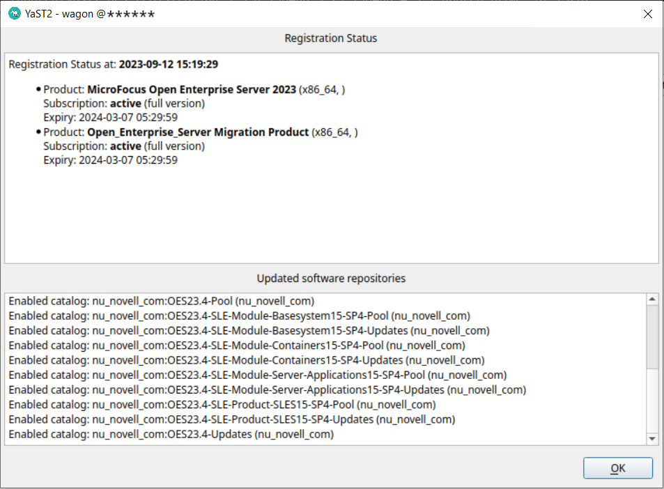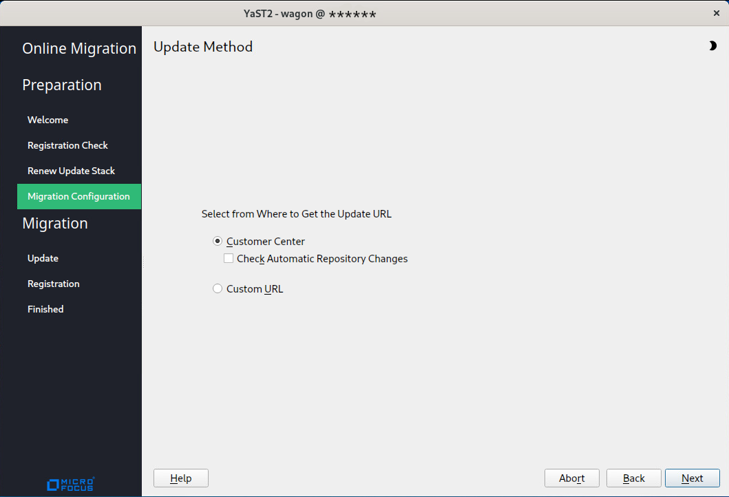 NOTE:If the repositories are not enabled, click Back > Next and redo the Micro Focus Customer Center registration until it is successful. If you are not able to do a successful Micro Focus Customer Center registration after multiple attempts, abort the process and roll back the server. For more information, see Section 5.6.4, Rolling back the Server in the Middle of a Wagon-based Channel Upgrade.