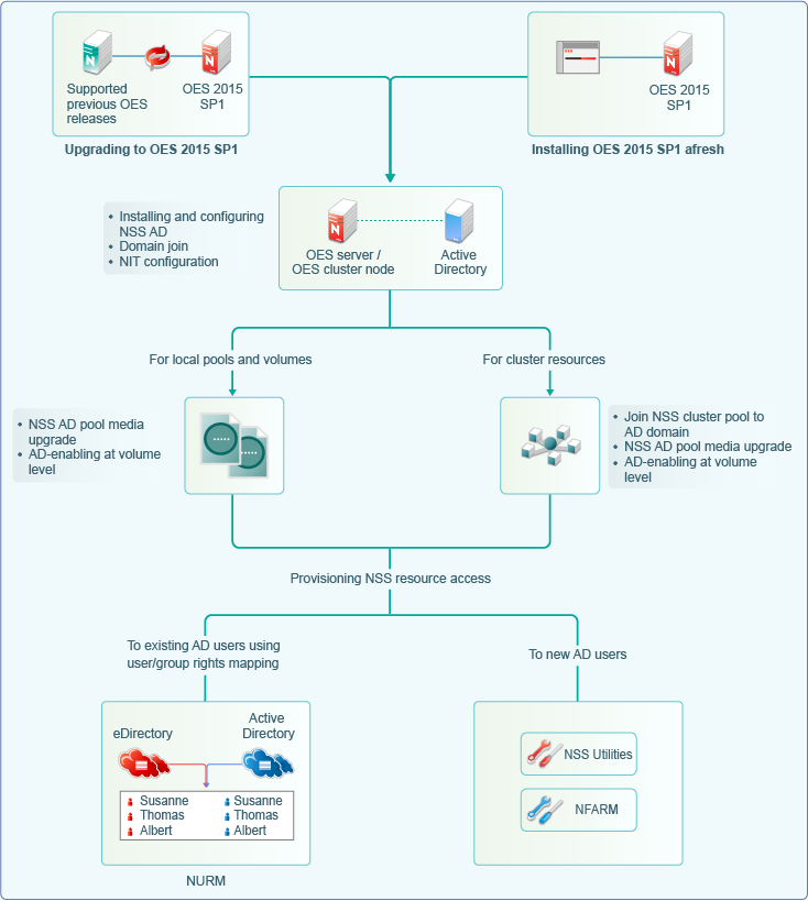 in the OES 23.4: NSS File System Administration Guide for Linux. NSS AD media upgrade is required only for NSS32 bit pools, and AD-enabling of volumes must be done for both NSS32 and NSS64 pools.
