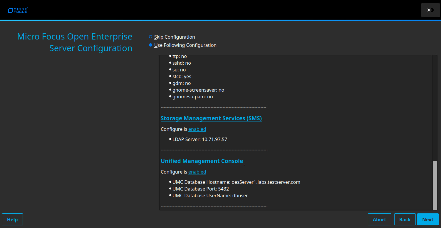 On the OES Unified Management Console (UMC) Configuration page, specify the new PostgreSQL database details and click Next.