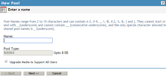 NSS supports only NSS64 pool type. NSS64 pools use 64-bit block addressing and supports upto 8 EB (exabyte) of pool size. All NSS64-bit pools are by default AD media upgraded.