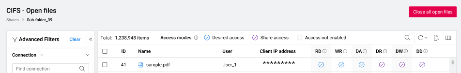 You can close all open files with the Close all open files option or you can close individual file or files in a CIFS share using the