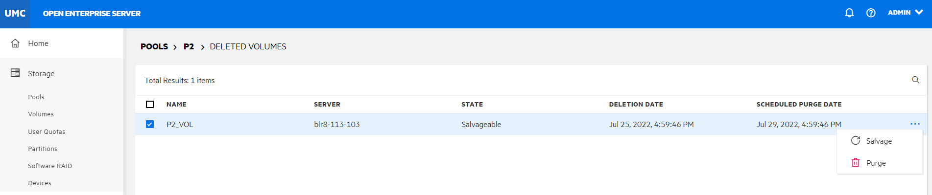 Select the deleted volume, click the (...) option, and then select Salvage/Purge.