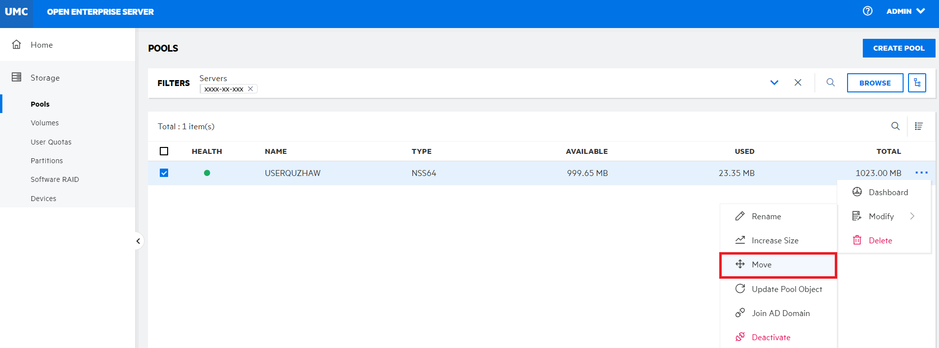 Select the pool you want to move, click More Options