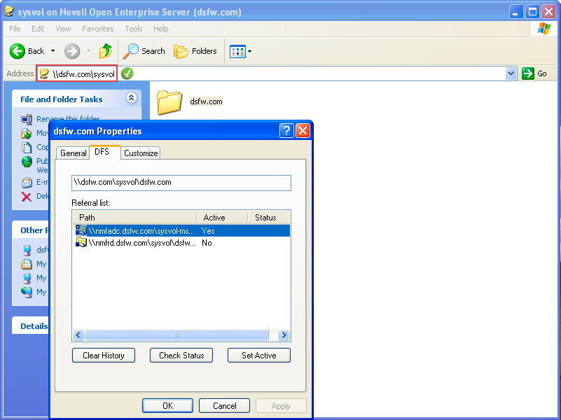 This procedure of settings the DFS referral can be used even if there are multiple domain controllers in a domain. However, while setting the DFS referral, you must ensure that you do not specify the fully qualified domain name of the domain controller in the file explorer to browse the SYSVOL folder. For instance, for a domain named dsfw.com that has multiple domain controllers nmfadc.dsfw.com and nmfrd.dsfw.com, you must specify \\dsfw.com\sysvol in the file explorer for setting the DFS referral as shown in the figure below.